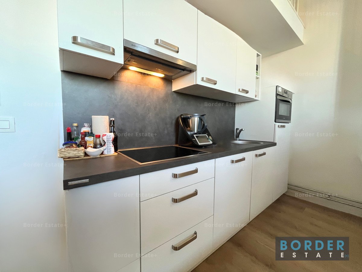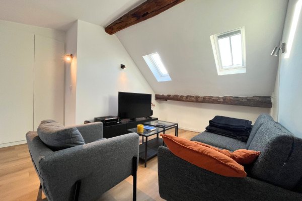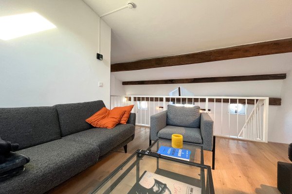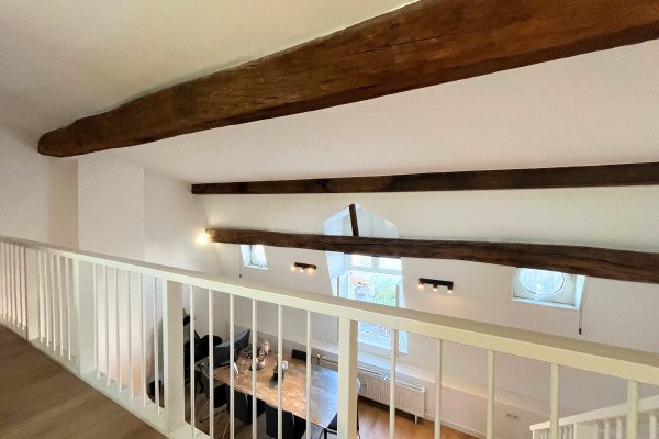 De lichte leefruimte vormt het hart van het appartement. Hier vallen de originele balken en het speelse split-level direct op. De gezellige zithoek sluit naadloos aan op de moderne keuken, voorzien van complete inbouwapparatuur en een strak werkblad. De eethoek bij het raam biedt een sfeervolle plek met uitzicht op de binnenstad.