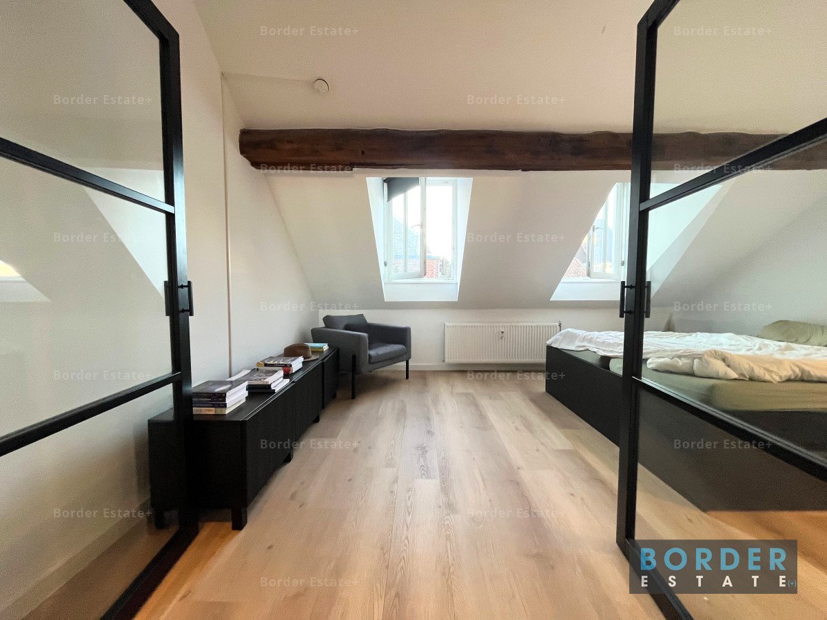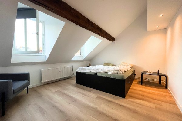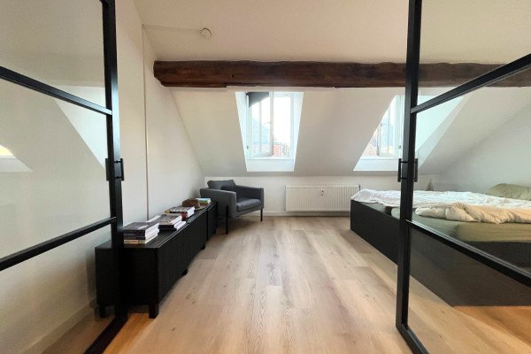 De slaapkamer is licht en ruim, met karaktervolle dakramen, houten balken en industriële stalen deuren die zorgen voor een eigentijdse uitstraling. De badkamer is modern en verzorgd, voorzien van een ruime douche, strak wastafelmeubel en fris tegelwerk.