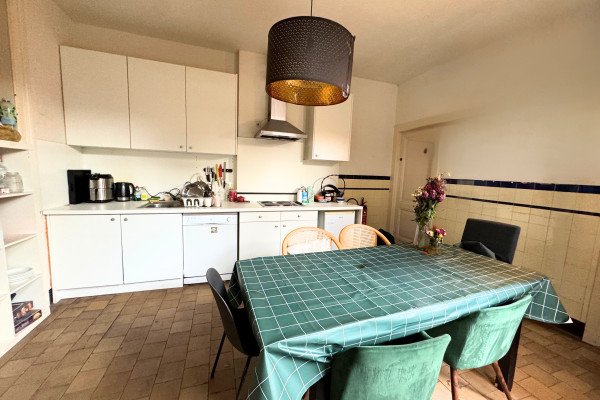 De kamer beschikt over een royale en lichte leefkeuken met een grote eettafel, een moderne inbouwkeuken voorzien van diverse apparatuur en volop opbergruimte. Aangrenzend bevindt zich de sfeervolle eetkamer met hoge plafonds, een warme houten vloer en authentieke details, wat samen zorgt voor een huiselijke en uitnodigende sfeer – perfect voor gezamenlijke diners of ontspanning.
